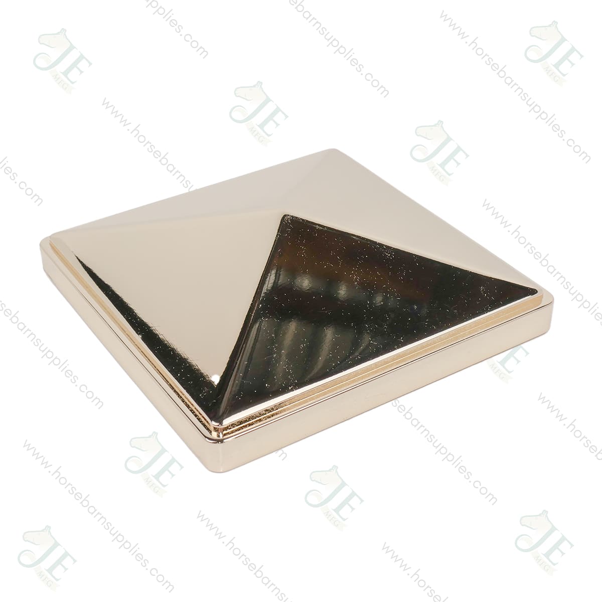 The 5″ Square Pyramid Polished Brass Finial Cap is a luxury decorative accent crafted to create a refined appearance on our European style stall front designs, which use 5″ heavy-wall square aluminum tubing. Milled from solid aluminum with a highly polished brass-plated finish, this is designed to complement both traditional and contemporary stable hardware while withstanding the conditions commonly found in equestrian environments. Its solid construction resists corrosion and requires minimal maintenance, making it well suited for high-use areas such as stables.